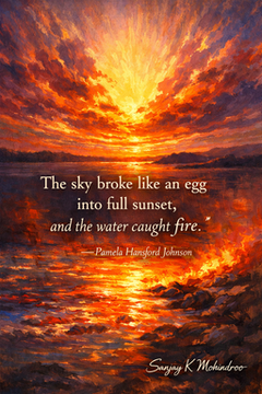 There is a line that stays with you: “The sky broke like an egg into full sunset, and the water caught fire.”